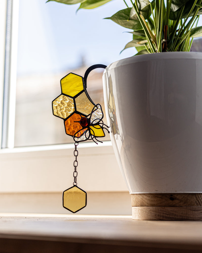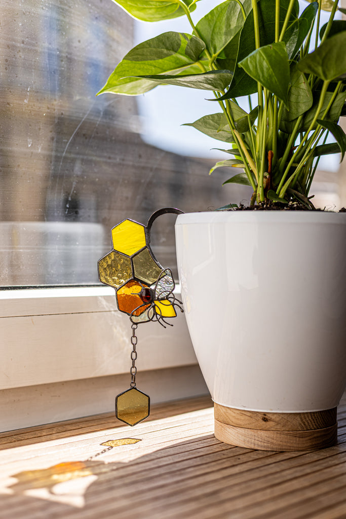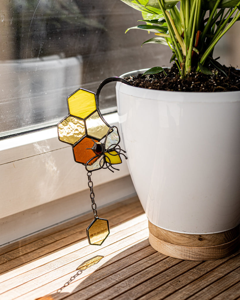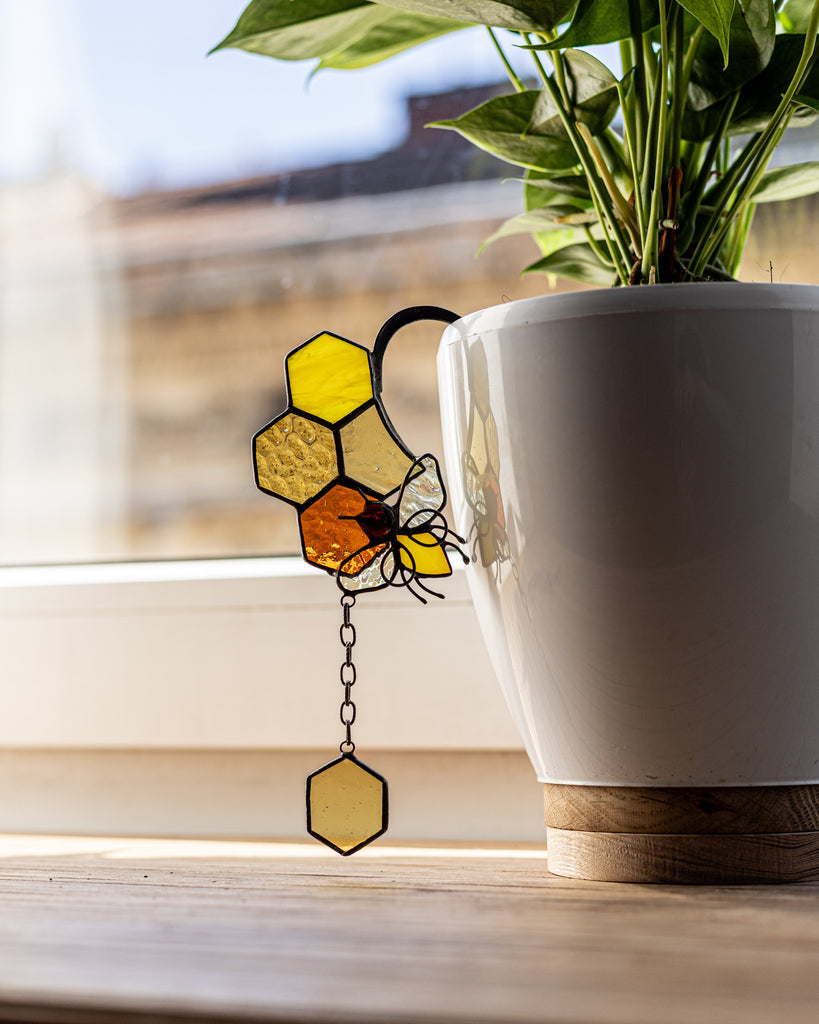 🌿 Handcrafted Stained Glass Bee with honeycombs – Plant Pot Stake