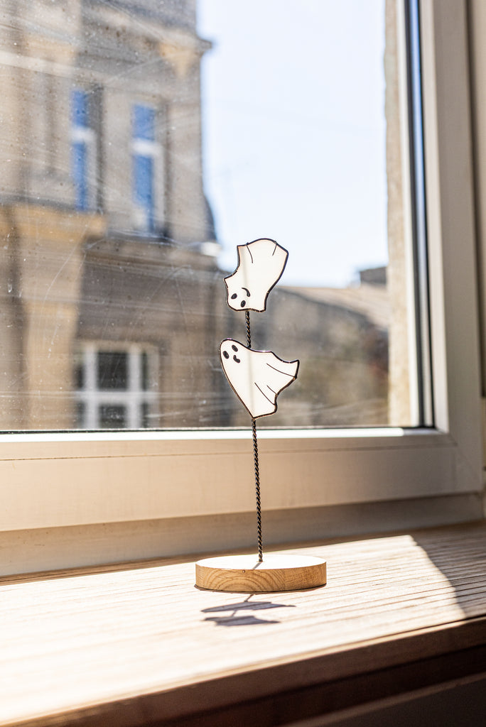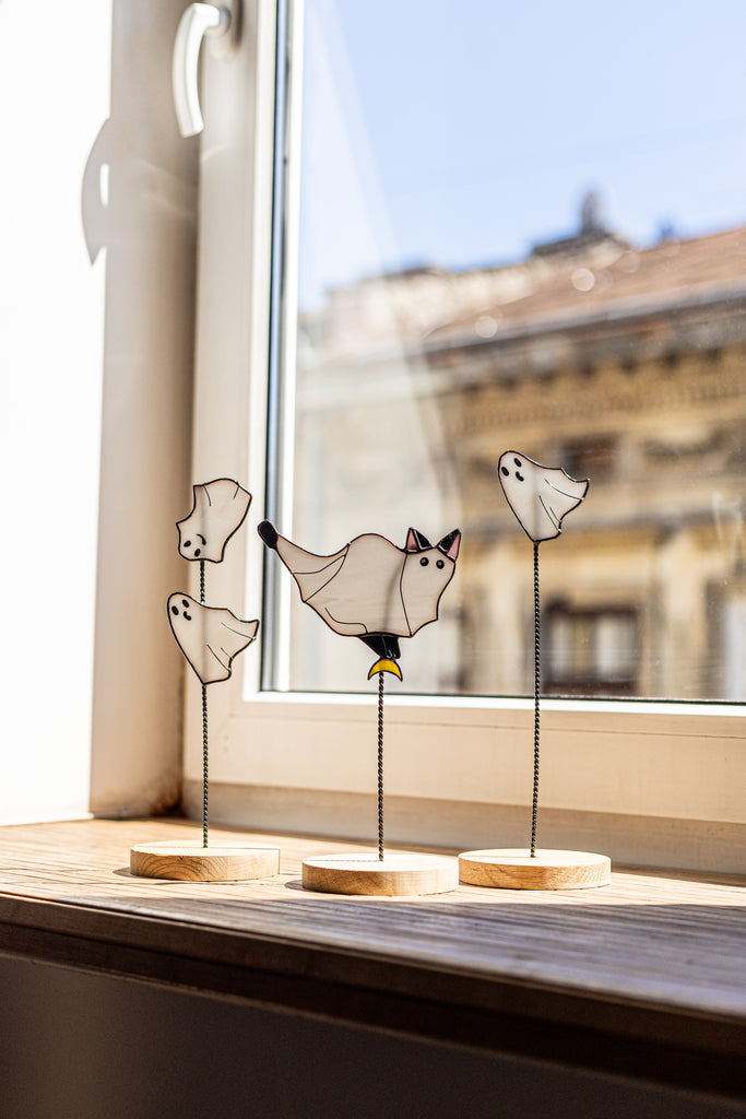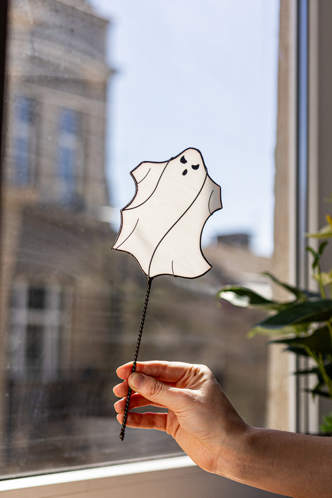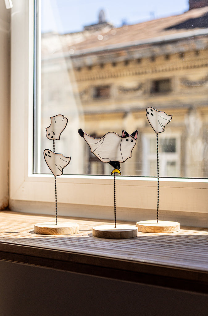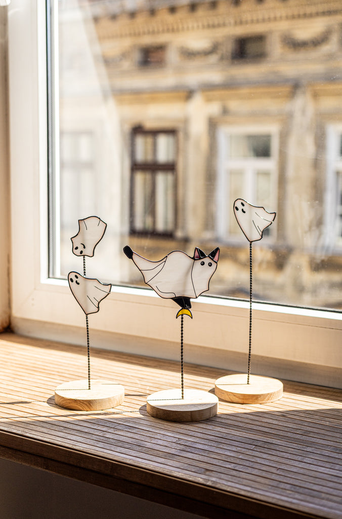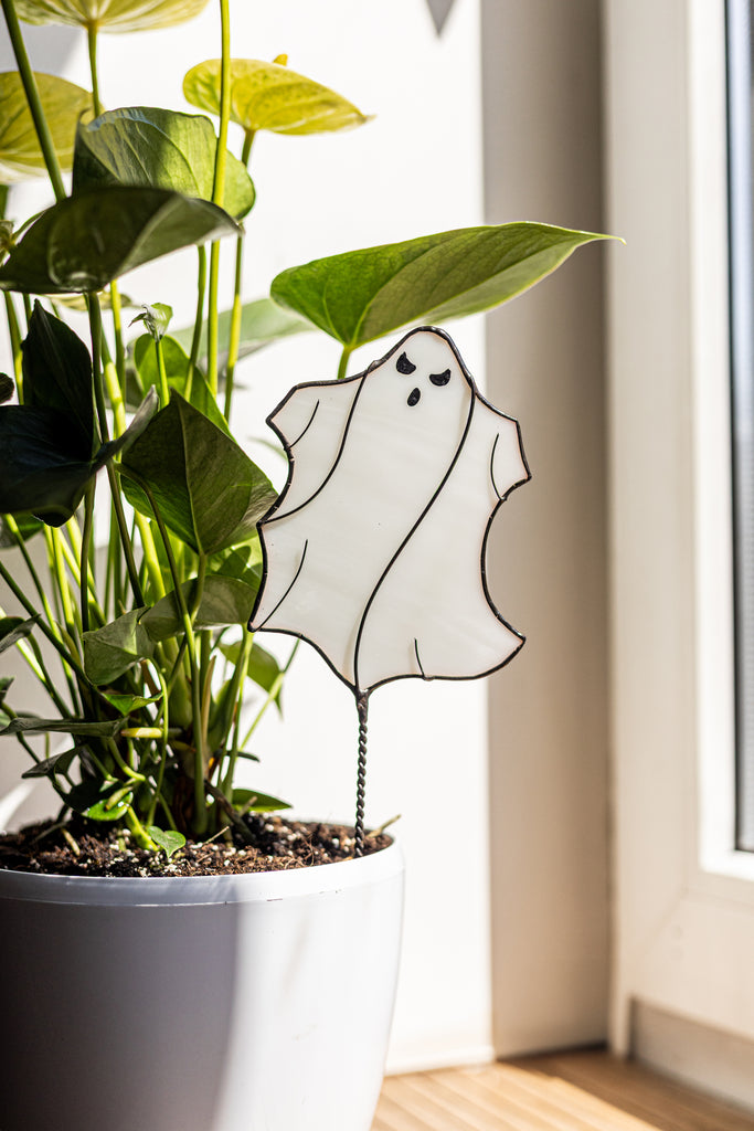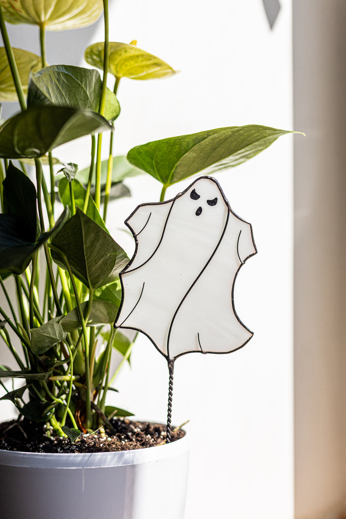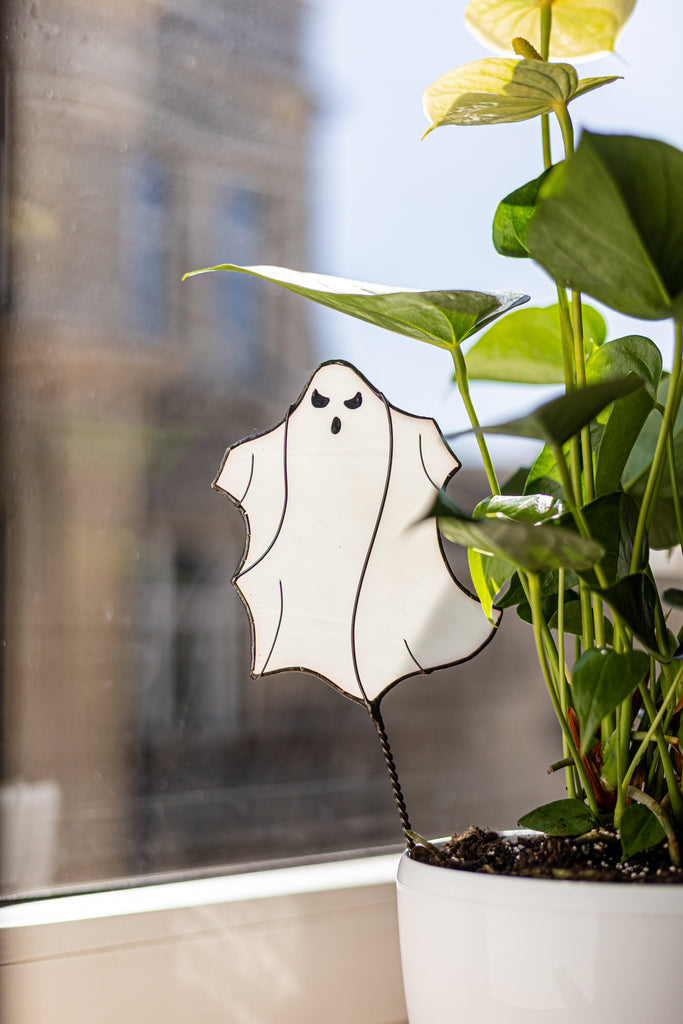 Stained Glass Funny Ghosts, Gothic Fall Plant Stake, Halloween Table Decor, Spooky Spirits on Wood Stand