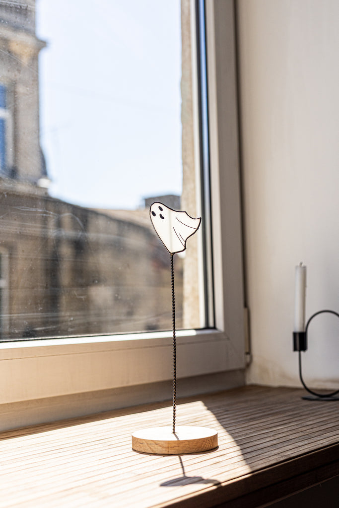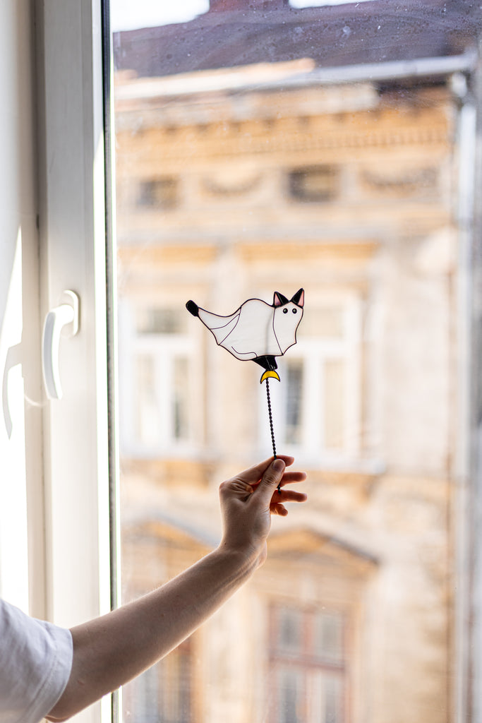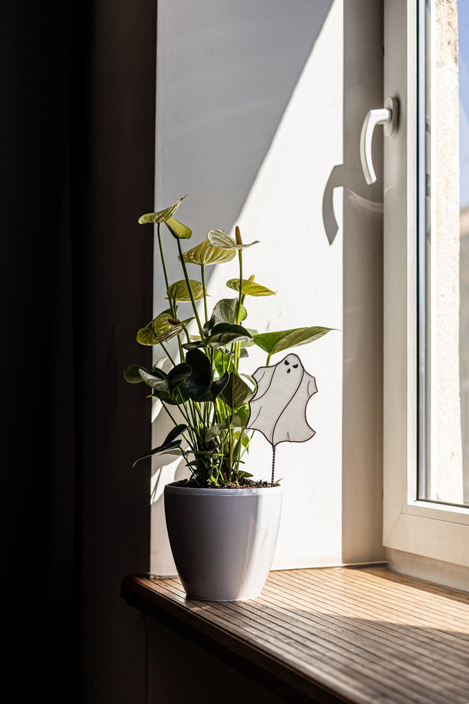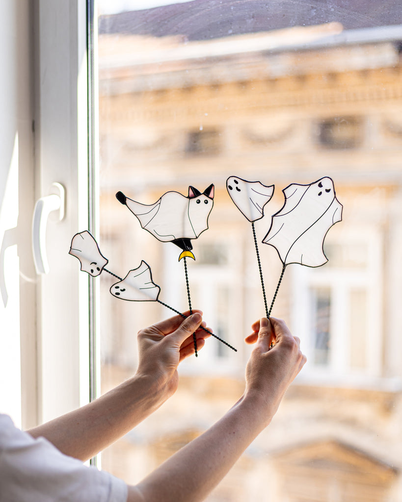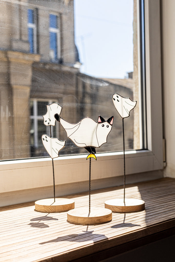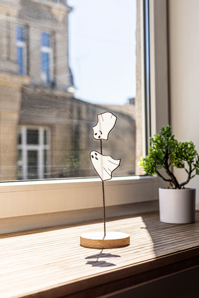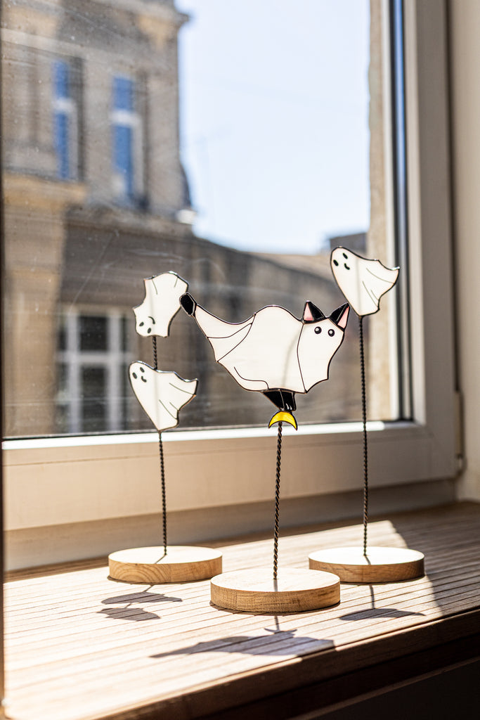 Stained Glass Funny Ghosts, Gothic Fall Plant Stake, Halloween Table Decor, Spooky Spirits on Wood Stand